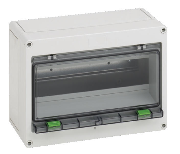 Specialty enclosures for installation of modular control and protection devices (17.5mm) such as MCBs, fuse holders, etc.. Access to these devices is provided through front transparent hinged window. IP65, IK07, double insulation. cULus certified.