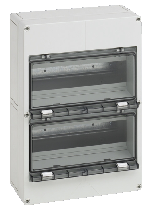Specialty enclosures for installation of modular control and protection devices (17.5mm) such as MCBs, fuse holders, etc.. Access to these devices is provided through front transparent hinged window. IP65, IK07, double insulation. cULus certified.