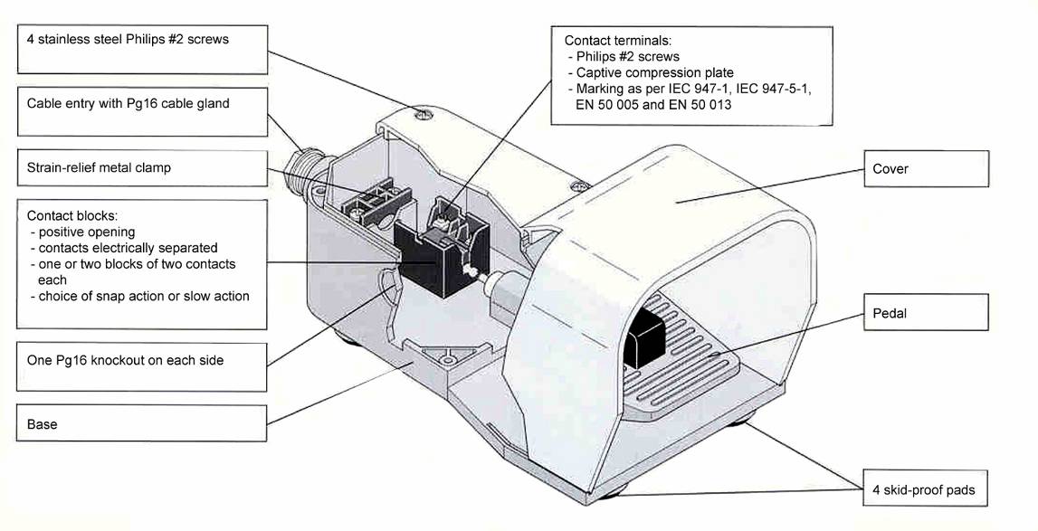 Double Foot Switch, free movement, yellow guard, spring returns, 1 (NO+NC) per pedal