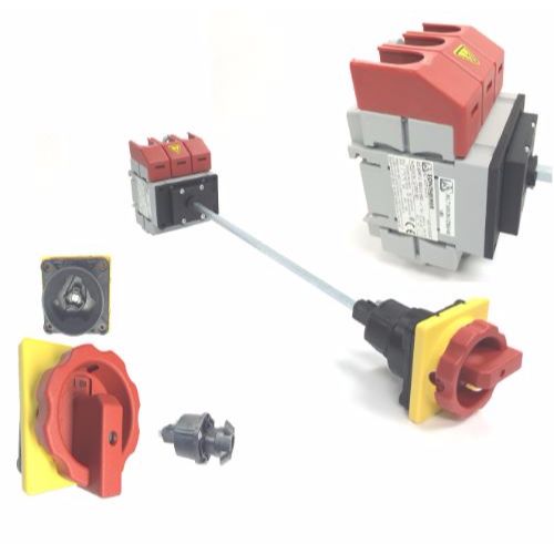 Panel mount disconnect switch with 300mm shaft and standard red/yellow rotary handle ‘Code 45’