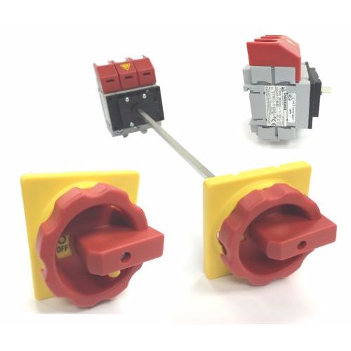 Panel mount disconnect switch with 300mm shaft and standard red/yellow rotary handle ‘Code 71’