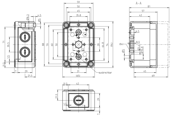 General purpose enclosure, IP66, IK07, double insulation, halogen free. – Models with Pg knockouts are end of series – see model with metric knockouts part No. SP106-502